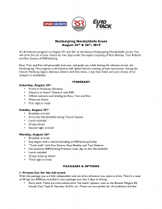 Click here to download a PDF document that provides you with all of the details about the itinerary, accommodations, cars, instruction, pricing and insurance for the August 25-26 Nurburgring program.